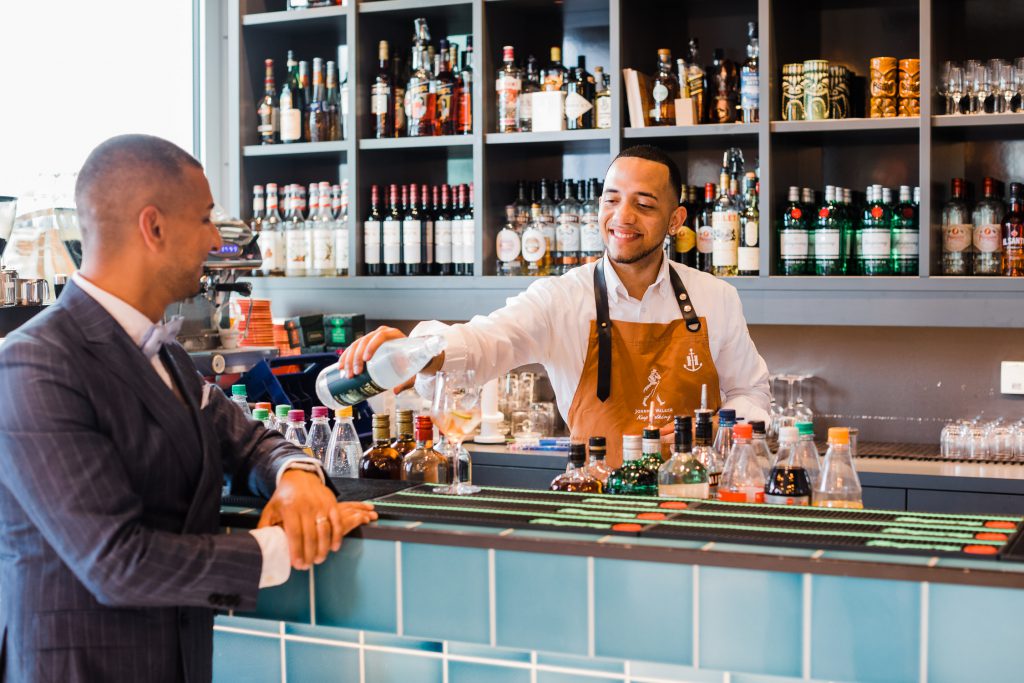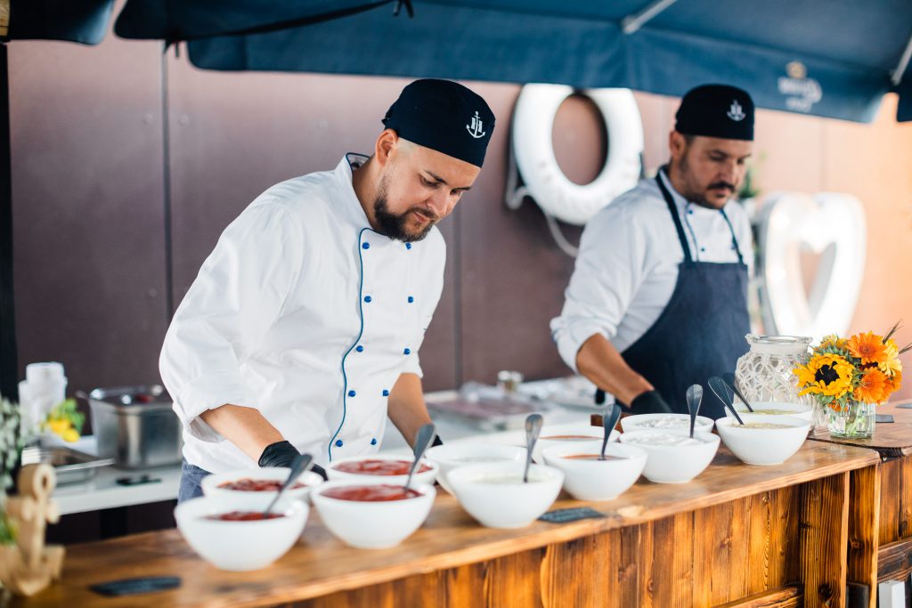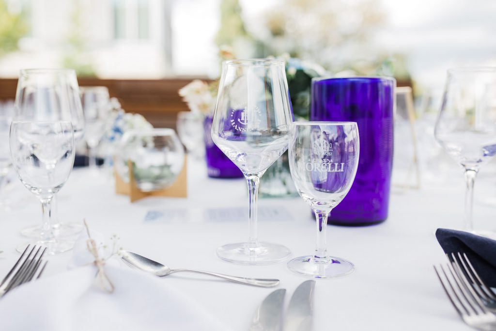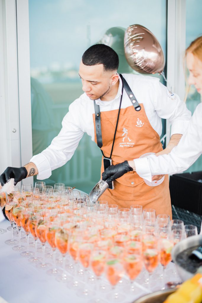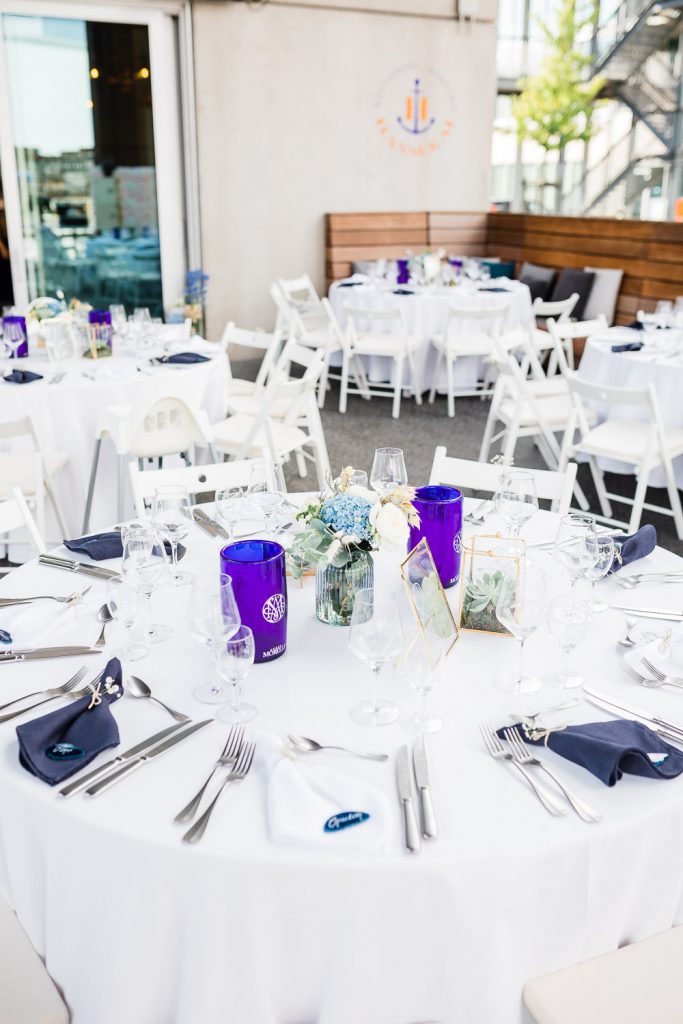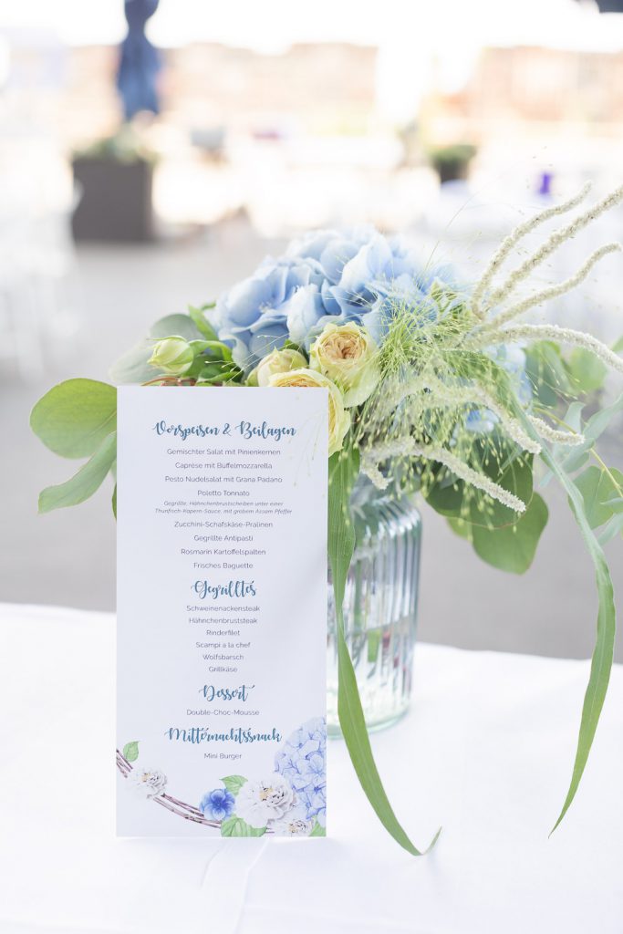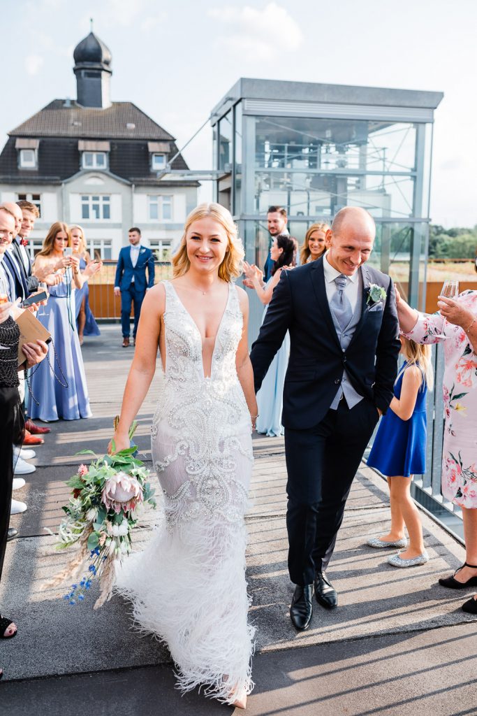 Die Gäste kamen leicht verspätet mit der Barkasse am eigenen Steg des Hansekai an. Trotzdem konnten sie das Brautpaar pünktlich auf der Dachterrasse bei einem kühlen Cocktail in Empfang nehmen. Anschließend fanden die Gäste zu ihren Plätzen auf der Außenterrasse der Location.
