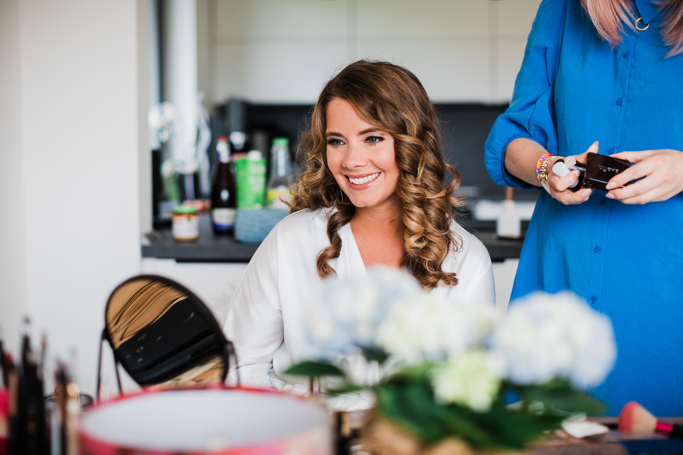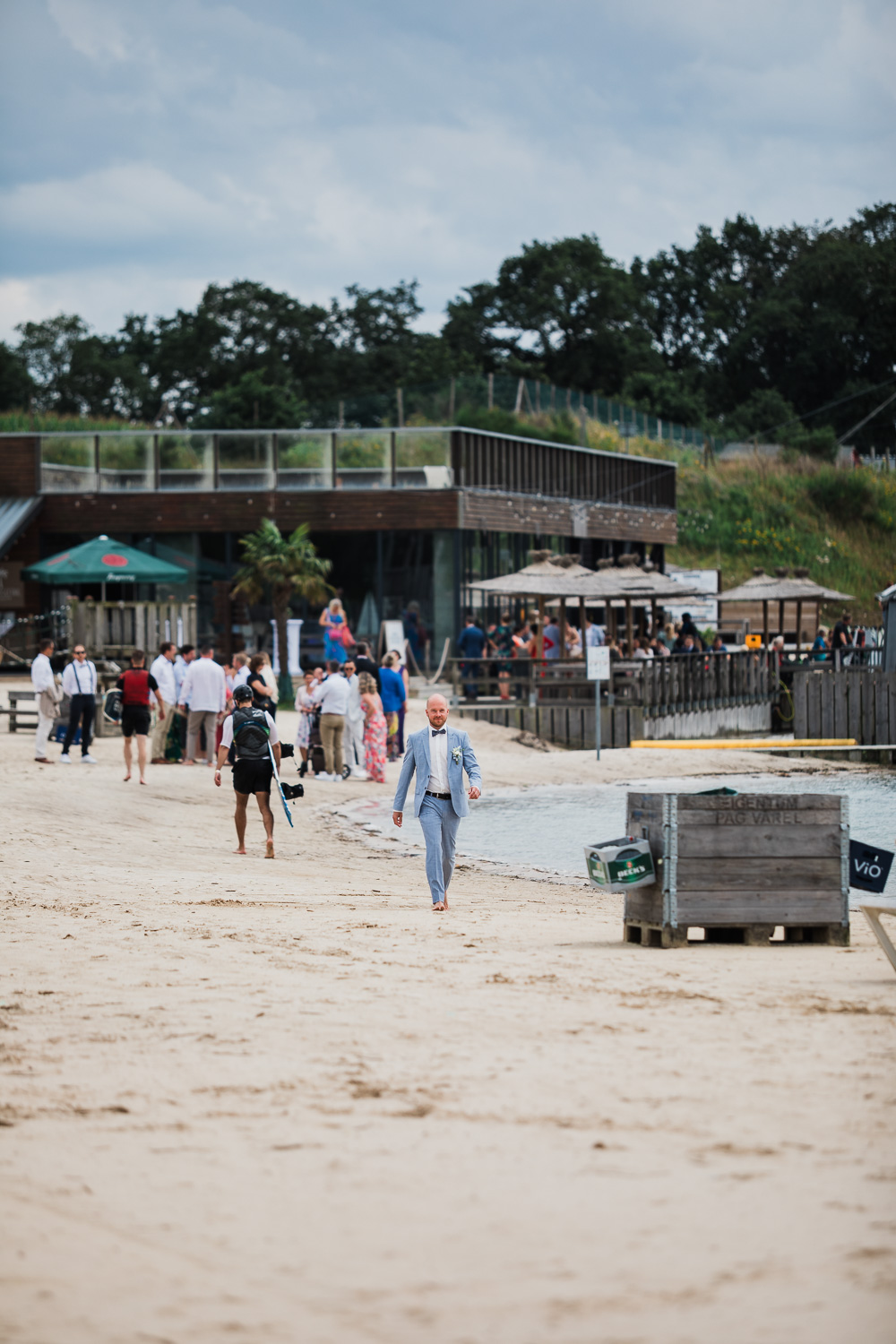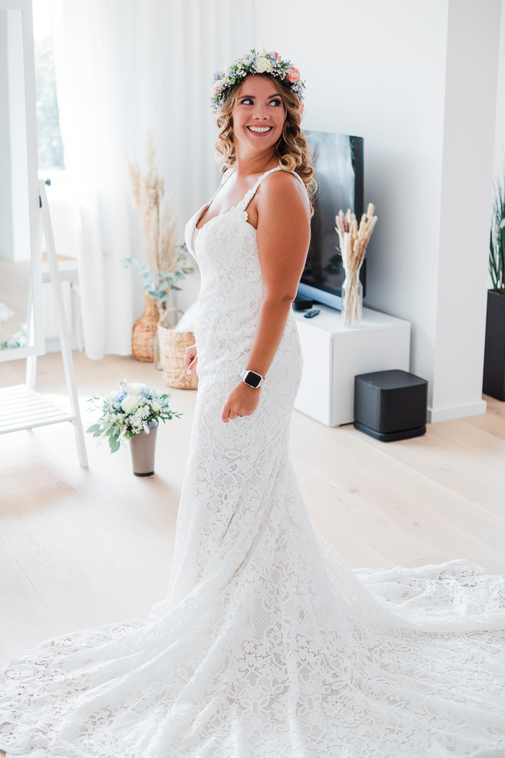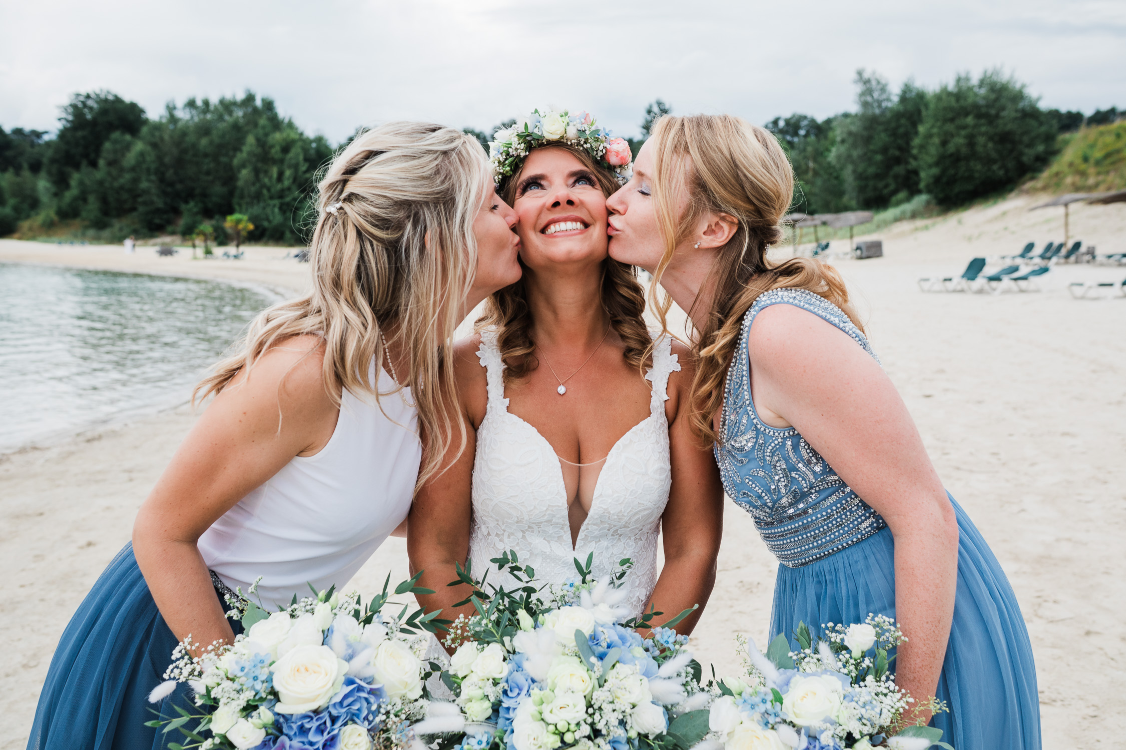 Die Hochzeitsfeier fand am nächsten Tag statt. Als Location entschied sich das Brautpaar für den Beachclub Nethen, der direkt an einem See mitsamt Kitesurf-Anlage gelegen ist. Passend zum traumhaften Wetter war hier als Dresscode “barfuß” angesagt. Doch bevor die Ringe mit Sand zwischen den Zehen getauscht werden konnten, ließ Jantje es sich zusammen mit Freundinnen beim Getting Ready gut gehen. Bei ausgelassener Stimmung, einem Glas Sekt in der Hand und guten Gesprächen bereiteten sich alle auf die große Zeremonie vor. Hierbei entstanden stilvolle Detailaufnahmen des Kleids und einiger Accessoires, die eine Hochzeitsreportage erst rund werden lassen.