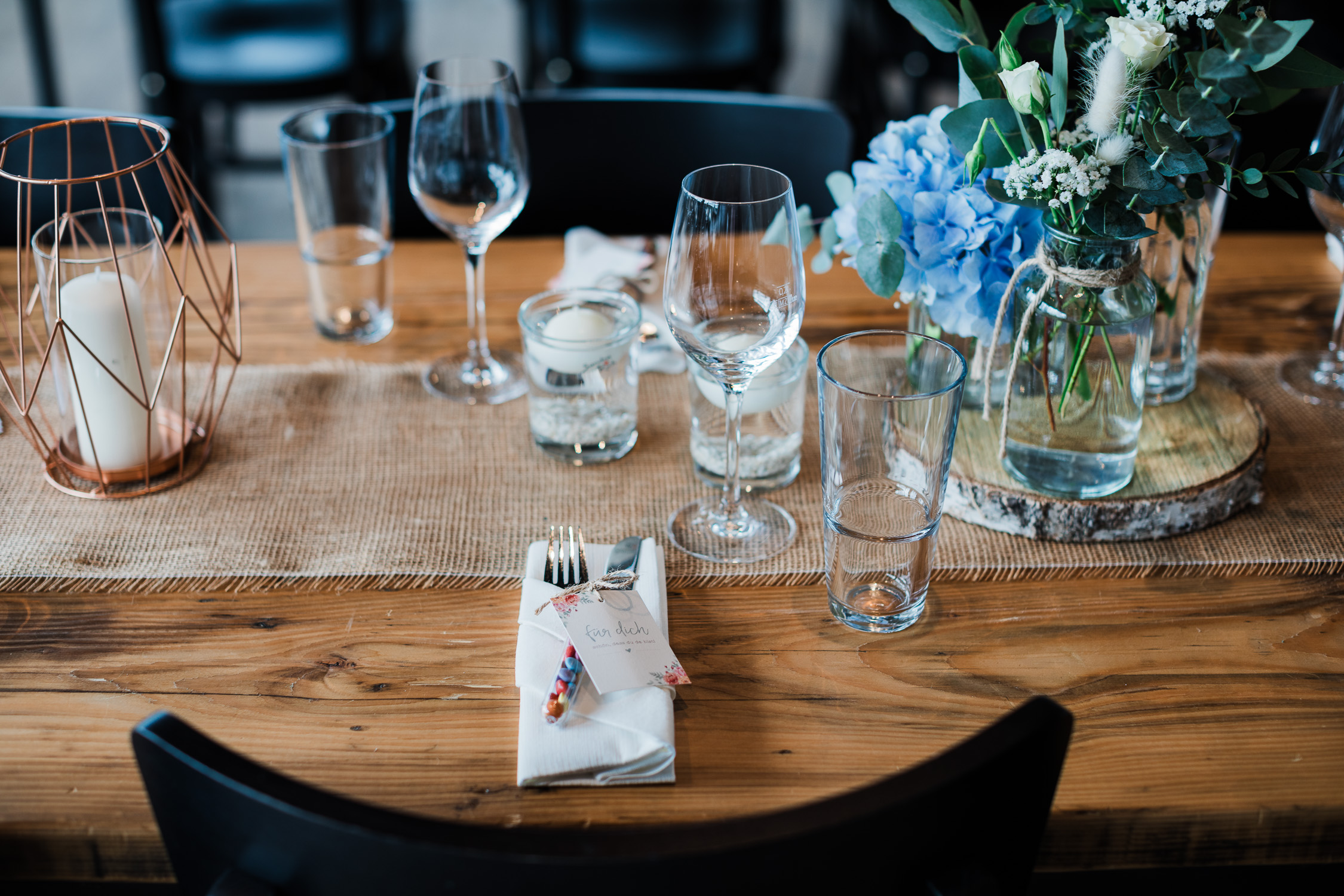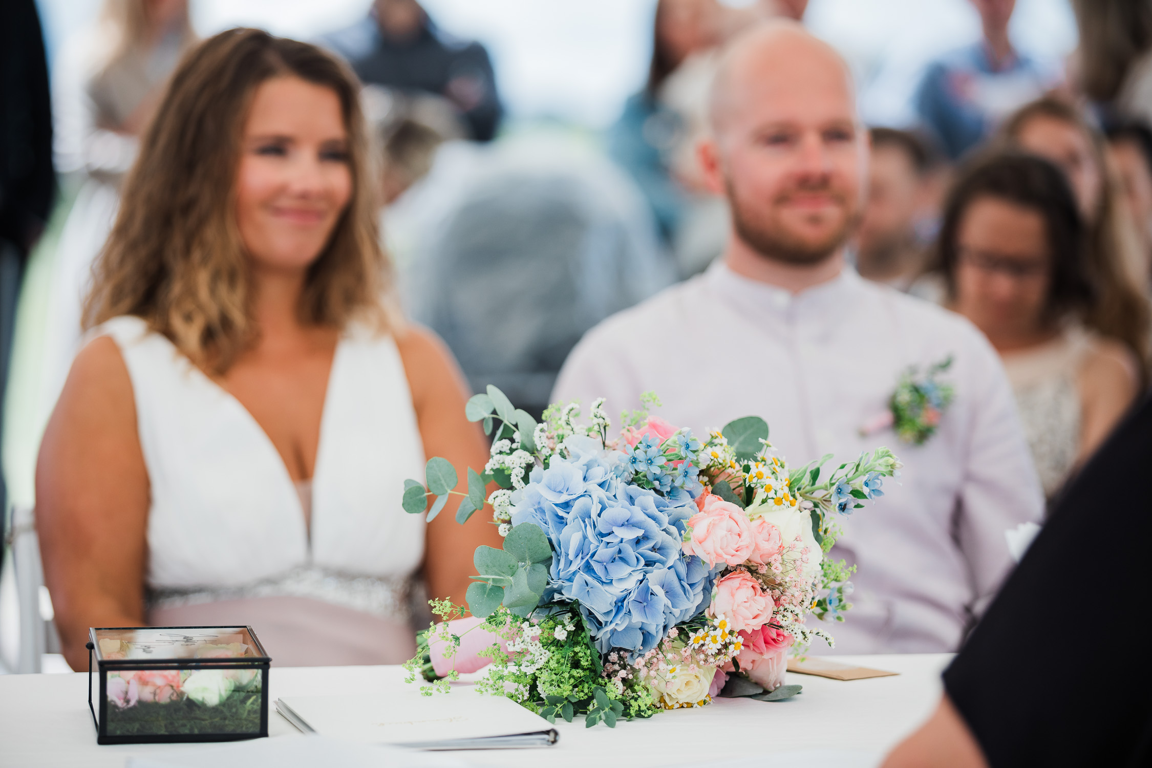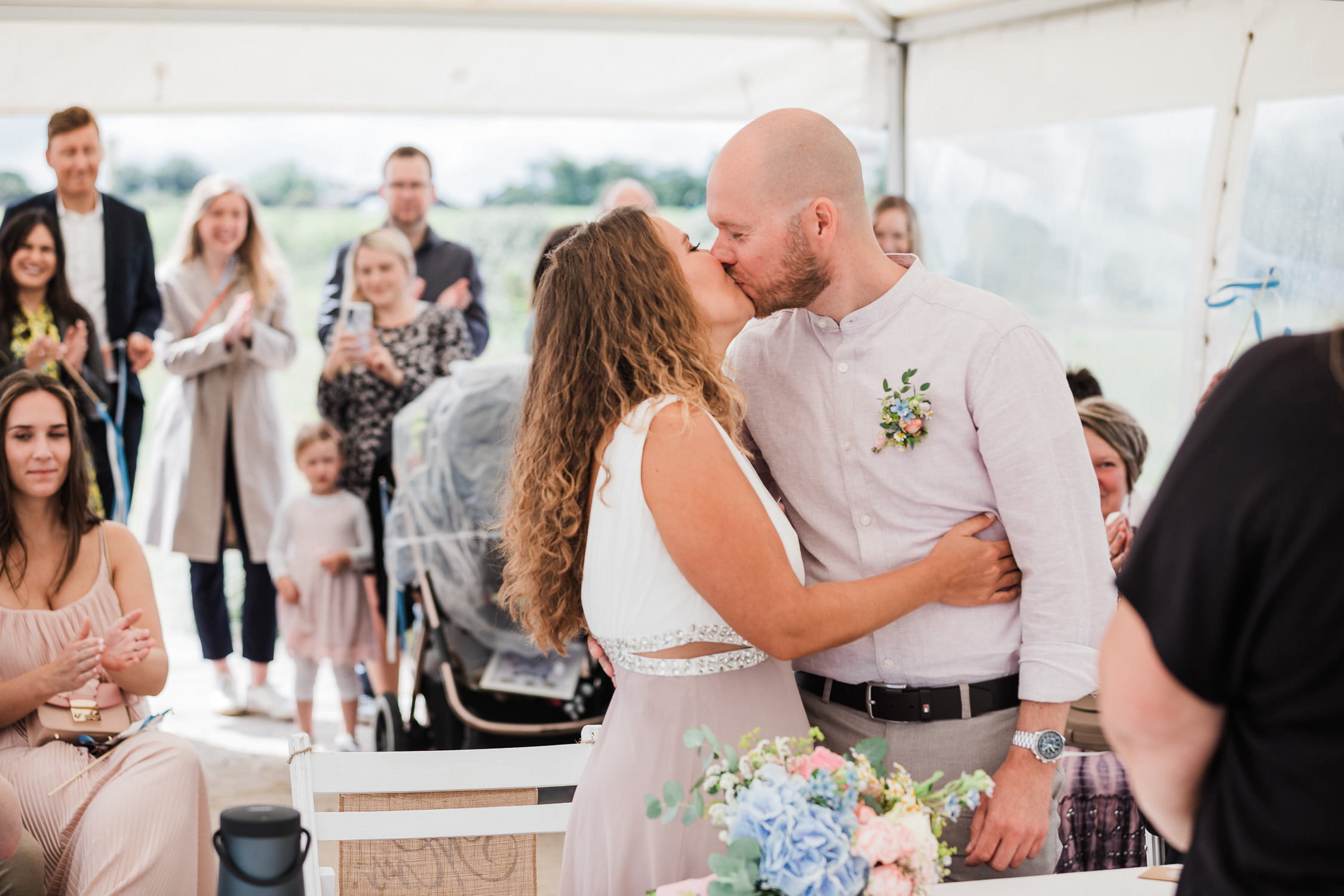 In Nethen angekommen warteten die Gäste bereits mit Blick auf den See auf den großen Moment, der von allen sehnlichst erwartet wurde. Die freie Trauung wurde mit persönlichen Worten der Traurednerin, musikalischer Untermalung und von den Gästen vorbereiteten Aktionen zum emotionalen Highlight des Tages. Anschließend fand ein weiteres Paarshooting statt, während sich die Gäste beim Sektempfang schon auf die abendliche Feier einstimmen durften.