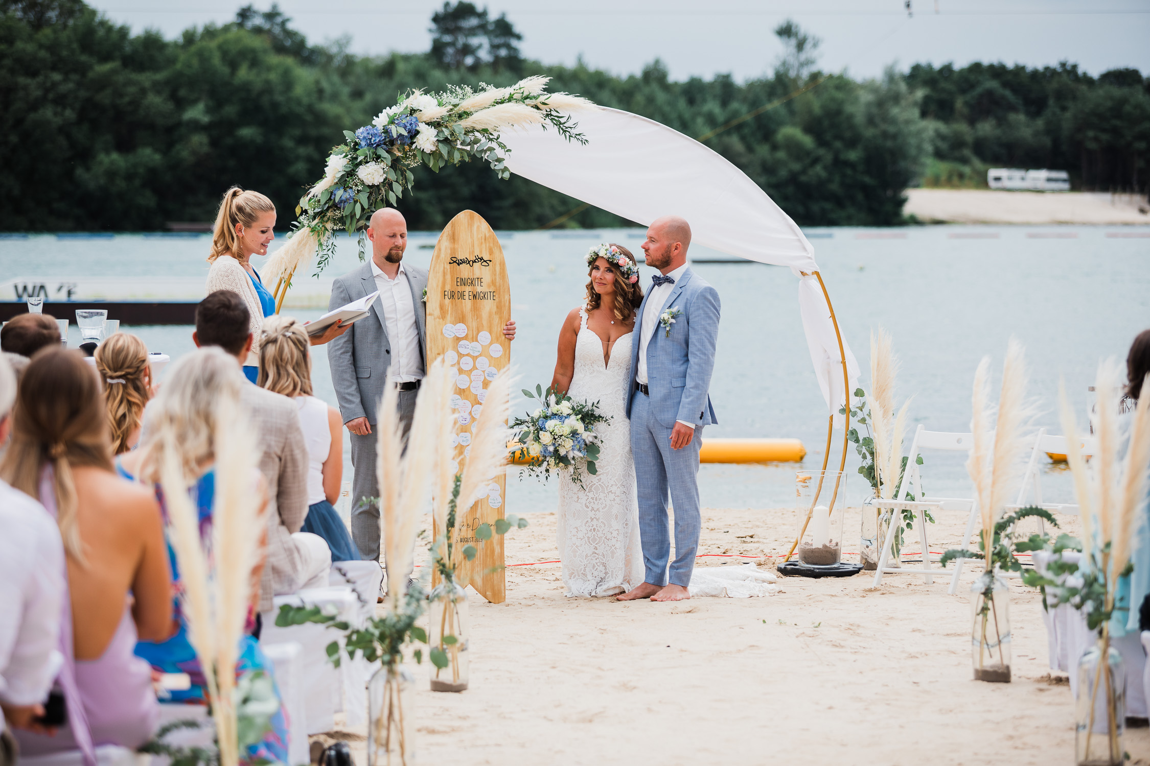 Die Trauung fand in einem Pavillon statt, der in liebevoller Handarbeit selbst dekoriert wurde. Auch der Camper durfte an diesem besonderen Tag nicht fehlen. Allerdings diente er diesmal nicht als nächtliche Unterkunft sondern wurde ebenfalls stilvoll hergerichtet, um als Beach- und Candybar zum Einsatz zu kommen. So wurde die standesamtliche Trauung direkt zu einer kleinen privaten Beachparty, die den perfekte Einstieg in ein traumhaftes Hochzeitswochenende bildete.